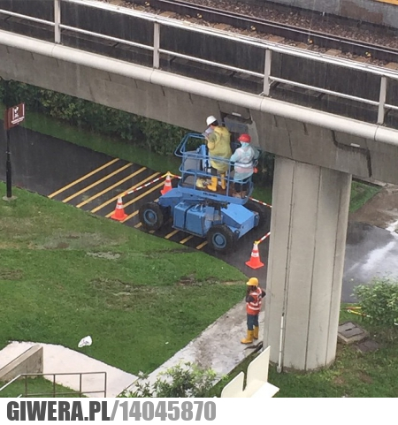Wysięgnik koszowy na wysuniętym i podniesionym ramieniu.