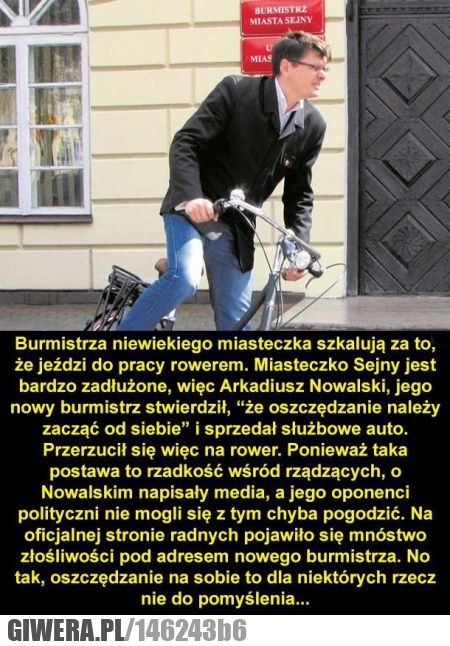Prezydent Słupska też jeździ do pracy rowerem... i on chyba robił to pierwszy w Polsce ale środowiska prawicowe nie pochwalą go za to, z wiadomych przyczyn... lubi po prostu pedałować więcej niż w jeden sposób :D Nie żebym bronił lewice albo zielonych... bo moim zdaniem to prowokatorzy i sprzedawczyki ale polityka taniego państwa nie jest wyjątkiem tylko w jednym środowisku politycznym. Niestety tego typu rozwiązania są jak tamowanie plastrem dziury po postrzale w aortę...