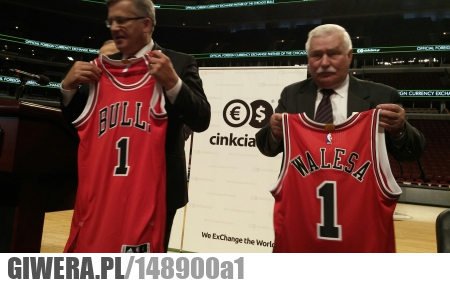 @anonim: Komorowski trzyma przód koszulki Chicago i widać "Bull(s)" i wychodzi jego pamiętny "bul". Wałęsa zaś, trzyma tył koszulki, na którym widnieje jego nazwisko. Zagadka rozwiązana.