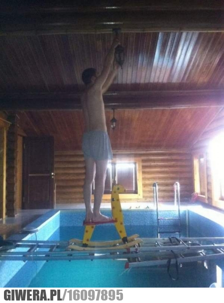 Jaki geniusz? Co gorzej może mu się stać to spadnąć do wody albo stłuc sobie jajka o drabine.
