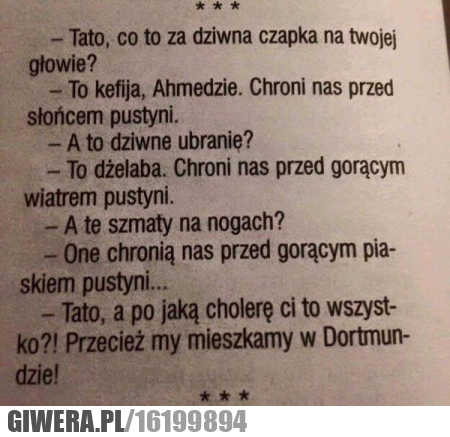 - Tato, a po cholere ci to wszystko?!? Przeciez jestes na zasilku i wiecznie pijany ze z domu nie wychodzisz! -