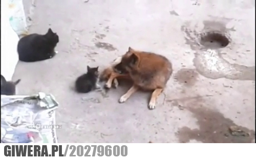 Zwróćcie uwagę... pies podchodząc prawie NIE MACHA OGONEM! - dla kotów machanie ogona, to objaw agresji. A pozwolenie, by pies bawił się z małymi kociakami znaczy, że zwierzaki znają się i przyjaźnią. Zwierzaki są super!!!