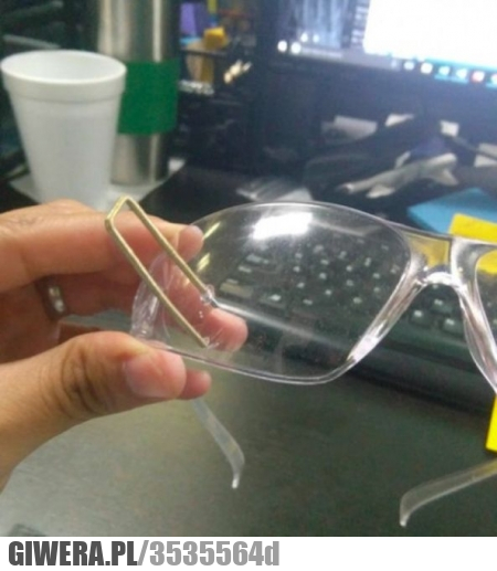 Znaczy strzeliło mu z jakiegoś dzikiego zszywacza czy coś? Okulary ochronne to chyba w jakimś warsztacie lub fabryce... -